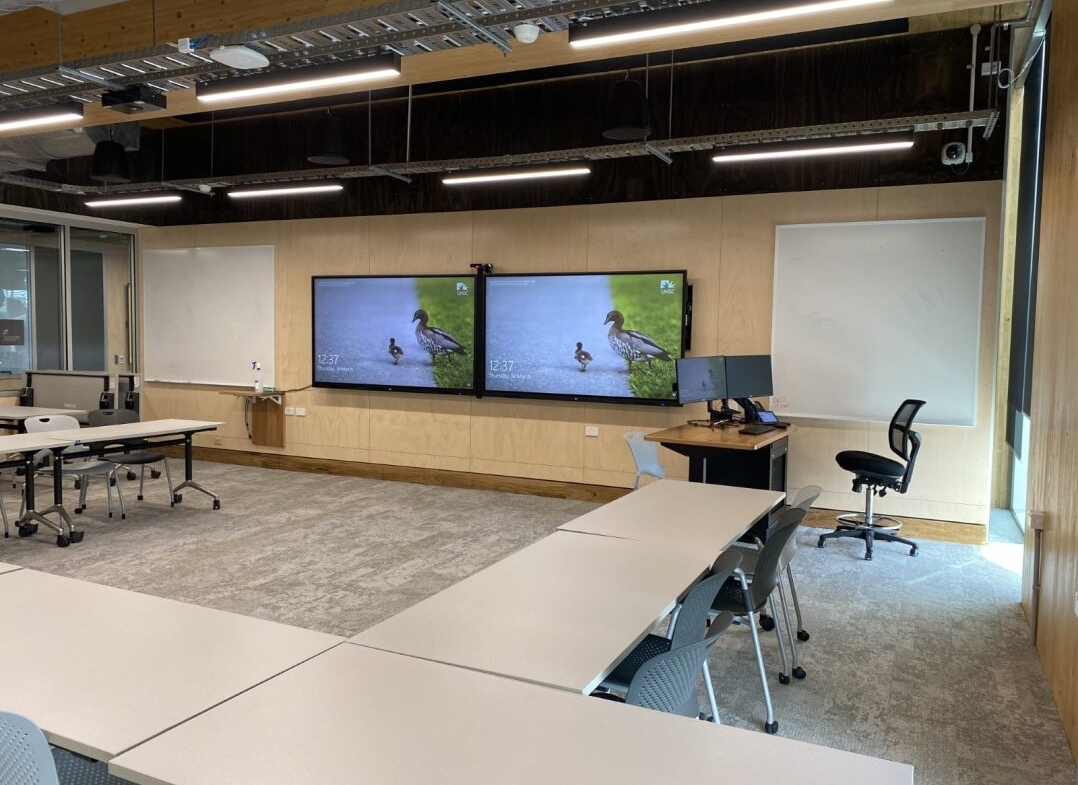 The Large Dual Display Teaching Space at UniSC is a cutting-edge environment designed for up to 100 participants, ideal for dynamic teaching and interactive learning. Featuring dual LG displays, this room provides clear, large-scale visuals that enhance both in-person and remote learning, supported by Space VC technology for seamless video conferencing. A Crestron over IP system ensures reliable video distribution, while a Shure audio network interface and dual-channel wireless receiver deliver crystal-clear sound. The Shure linear array microphone ensures precise audio capture, complemented by QSC loudspeakers for immersive sound throughout the space. Control is simplified with Crestron touch panels, managing AV systems, lighting, and environmental settings. An Axis IP camera enhances recording and remote participation capabilities, while a Williams hearing augmentation system ensures full accessibility. The integrated AV system is optimized for unified communications, featuring Innomate’s Innomesh platform for robust AV and unified communications support. This includes proactive monitoring via AVaaS and UCaaS solutions, ensuring reliable and efficient operation.