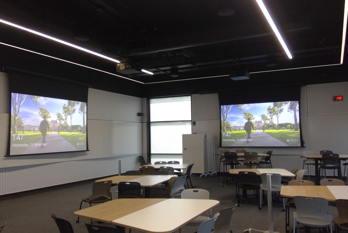 The Large Quad Projector Teaching Space at UQ is a high-tech environment for up to 100 participants, perfect for dynamic teaching and hybrid learning. It features four Sony projectors for vibrant multi-screen displays and Space VC technology for seamless video conferencing. The room’s AV system is powered by a Crestron setup, with intuitive control via the Crestron touch panel. Audio is delivered through a Biamp Tesira DSP and Shure microphones, complemented by JBL speakers. The space supports BYOD, with a Micro PC, and HDMI adapters, Intouch preview monitor, and Elmo document camera for diverse presentations. Integrated lighting and motorized blinds enhance the environment, while Echo 360 records lectures for future access. The integrated AV system is optimized for unified communications, featuring Innomate’s Innomesh platform for robust AV and unified communications support. This includes proactive monitoring via AVaaS and UCaaS solutions, ensuring reliable and efficient operation.