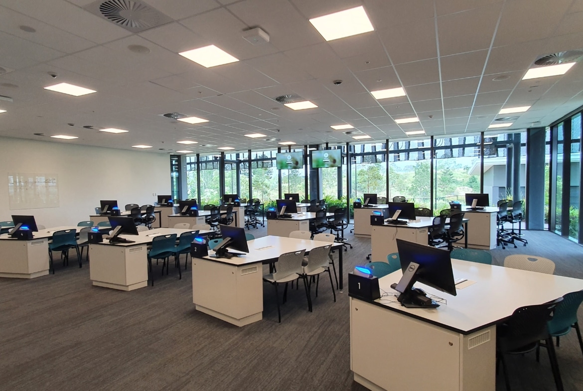 The Collaborative Learning Space at UNISC is designed to facilitate interactive and flexible teaching methods, accommodating up to 85 people. This advanced AV/UC environment features multiple touch panels and a DSP for superior audio quality, ensuring an immersive and engaging experience for both instructors and students. The room is equipped with cutting-edge audio-visual technology, including high-quality speakers and LCD TVs, enhancing the visual and auditory experience. Each of the 14 learning pods is fully equipped with a PC, touch panel, and PC monitor, allowing for collaborative group work and seamless access to digital resources. The inclusion of AirMedia technology supports wireless presentation capabilities, enabling easy connectivity and BYOD (Bring Your Own Device) options. Leveraging Innomate’s Innomesh platform, the room offers robust AV and unified communications support, with features like AV Room Control, AV Room Monitoring, and AV Remote Monitoring and Management. The space is integrated with AVaaS and UCaaS solutions, providing reliable, centralized management and support.
