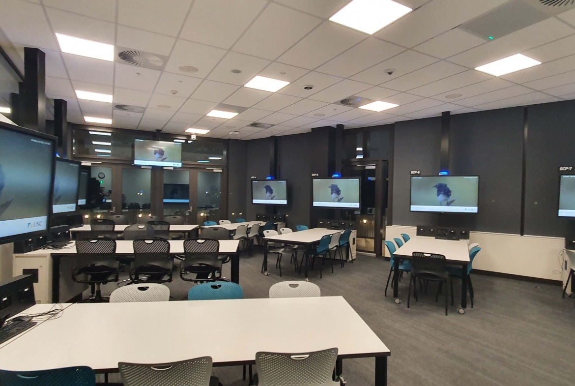 The Collaborative Studio at UniSC offers a flexible, technology-rich space for up to 50 people, perfect for teaching and video conferencing. Equipped with 8 Crestron Touch Panels for intuitive AV control, the room features wireless presentation, PTZ conference cameras for video conferencing, and confidence monitor.The AV system includes Crestron AVoIP encoders/decoders, Crestron Matrix switcher, 8 Dell LCD displays, QSC DSP and QSC speakers for clear sound. Shure microphones (handheld, lapel, and ceiling-mounted) ensure high-quality audio. Supporting BYOD, this studio is ideal for dynamic collaboration and hybrid learning. Innomate’s Innomesh platform provides reliable AV and unified communications support, control, and proactive monitoring via Innomate’s AVaaS and UCaaS single platform solution.