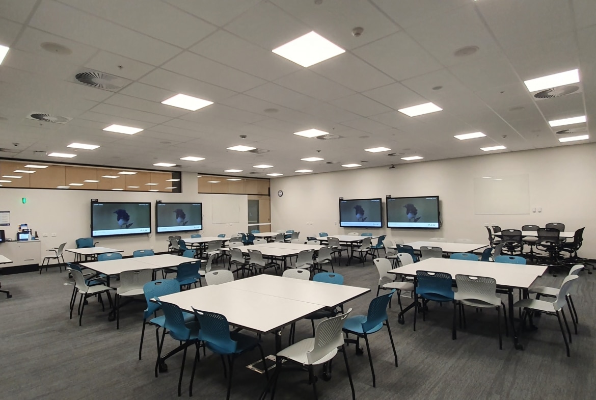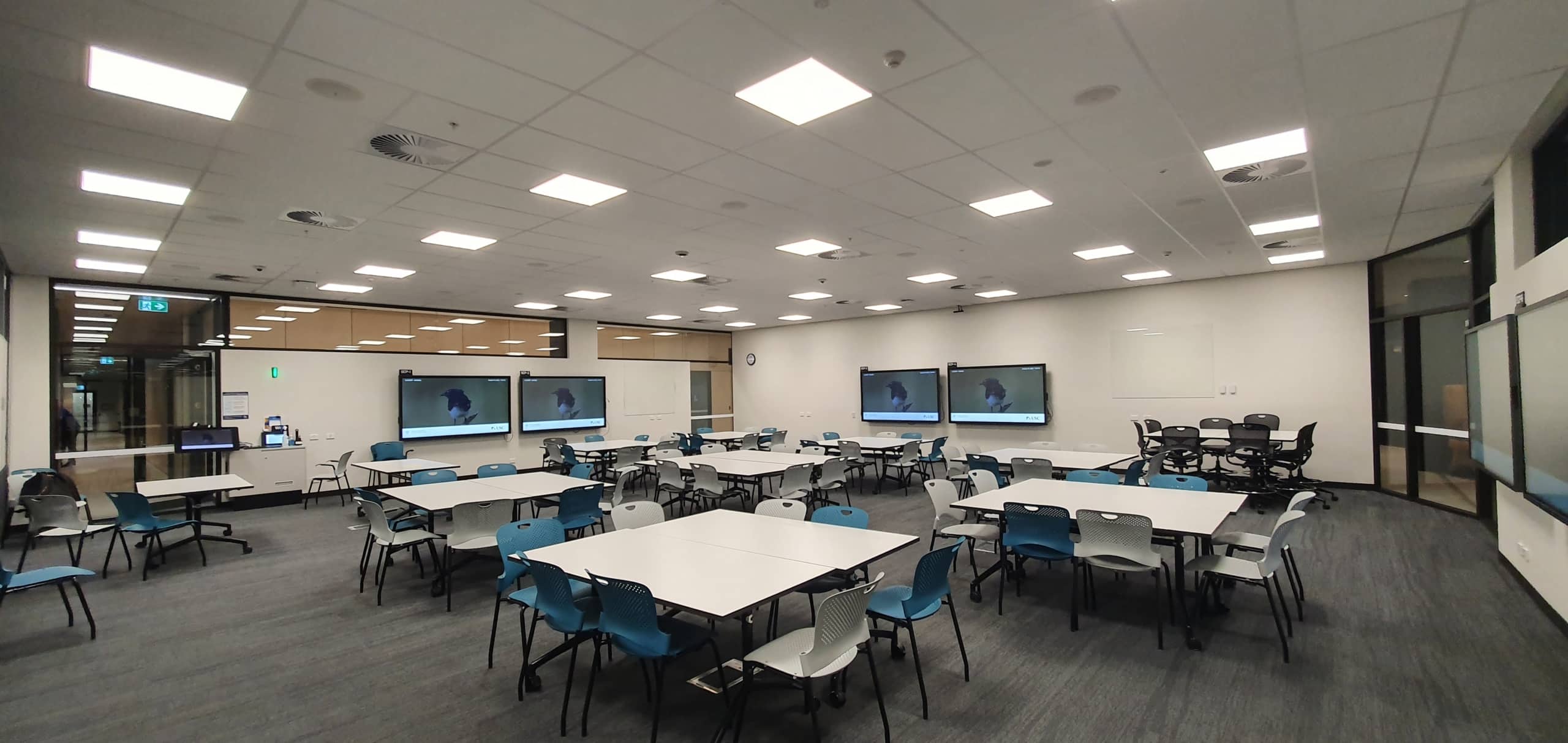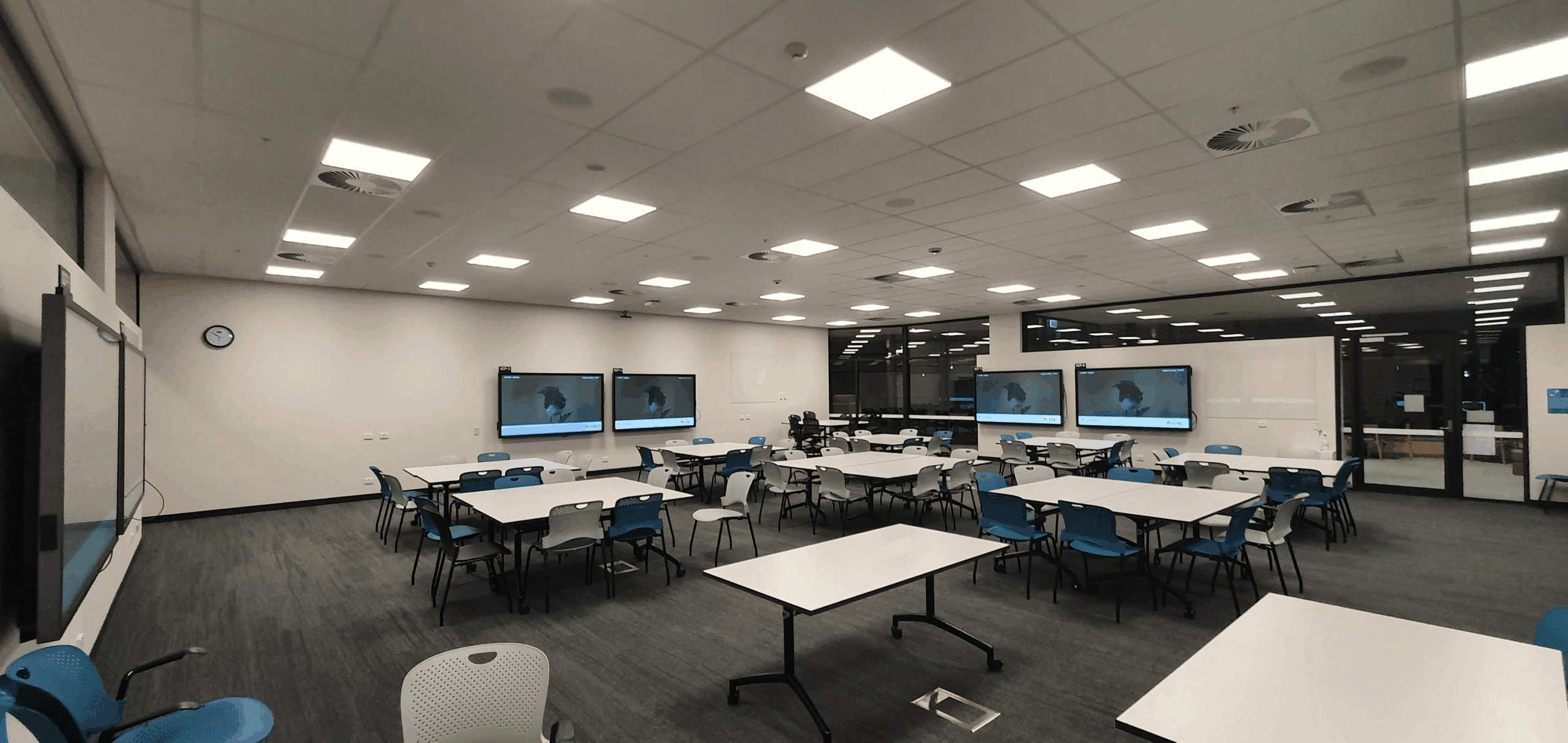 The Collaborative Studio, situated at UniSC, is an expansive and versatile space tailored for large-scale teaching sessions, workshops, and collaborative events, with a capacity of over 100 participants. This studio is designed to foster an engaging and interactive learning environment, supporting a wide range of teaching and presentation styles.The room is equipped with Crestron’s advanced AV Room Control system, ensuring seamless management of all AV functions. Five Dell displays, two AXIS PTZ cameras facilitate high-quality video conferencing, integrating smoothly with the underlying Space VC technology for unified communications. For audio, the studio includes a SHURE digital wireless receiver, accompanied by handheld and wireless microphones, providing crystal-clear sound throughout the space. A touch display with a pen is available for interactive presentations, enhancing the collaborative experience. Additionally, the room is outfitted with Crestron’s encoders and decoders to ensure reliable AVoIP (Audio Video over IP) transmission. Comfort and accessibility are further enhanced by a Crestron touch screen for room booking, a confidence LCD monitor, and an integrated hearing augmentation system. The space is fully monitored and managed via the Innomesh platform, providing proactive AV support and unified communications through AVaaS and UCaaS solutions, ensuring a seamless and productive experience for all users.