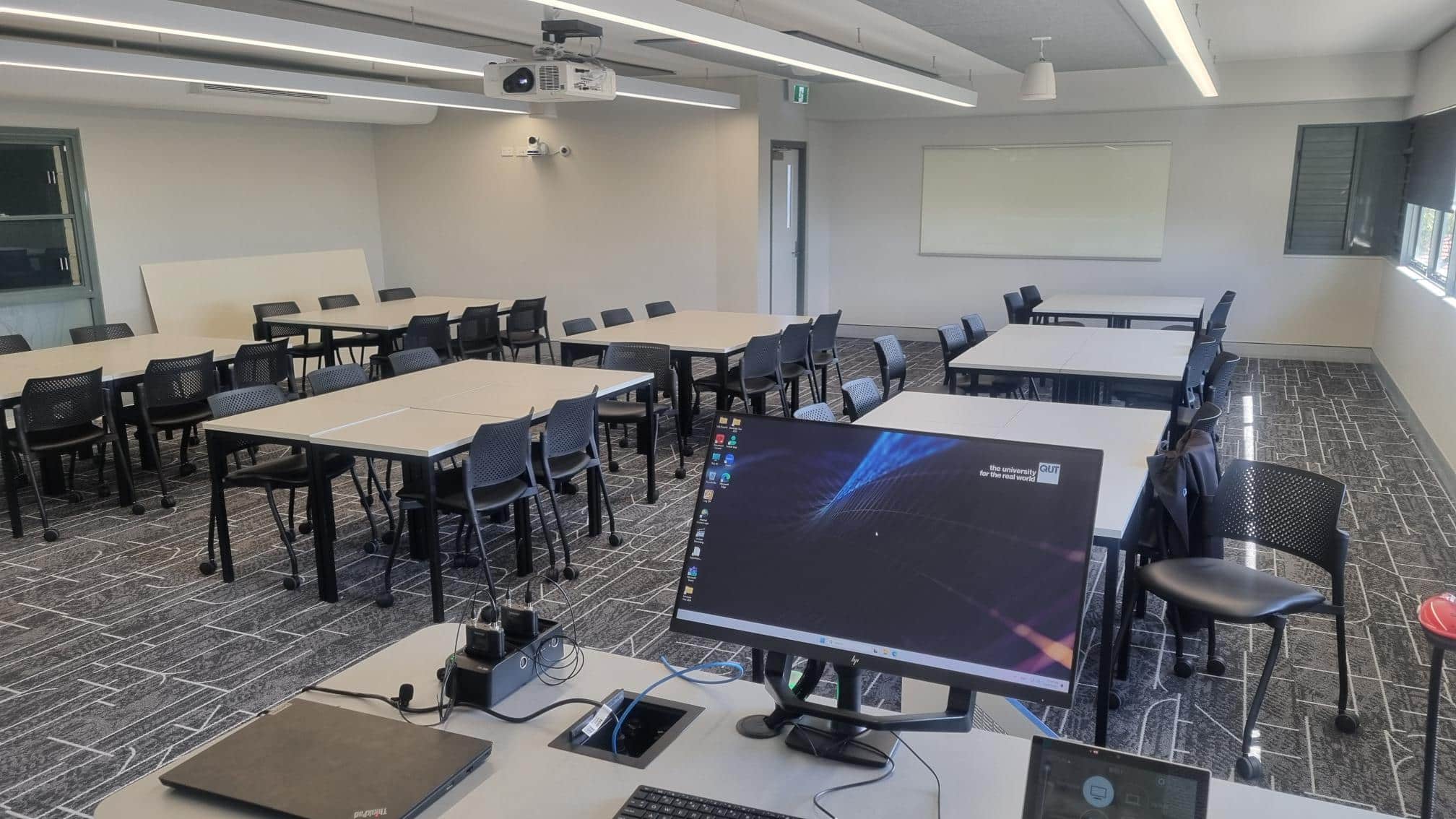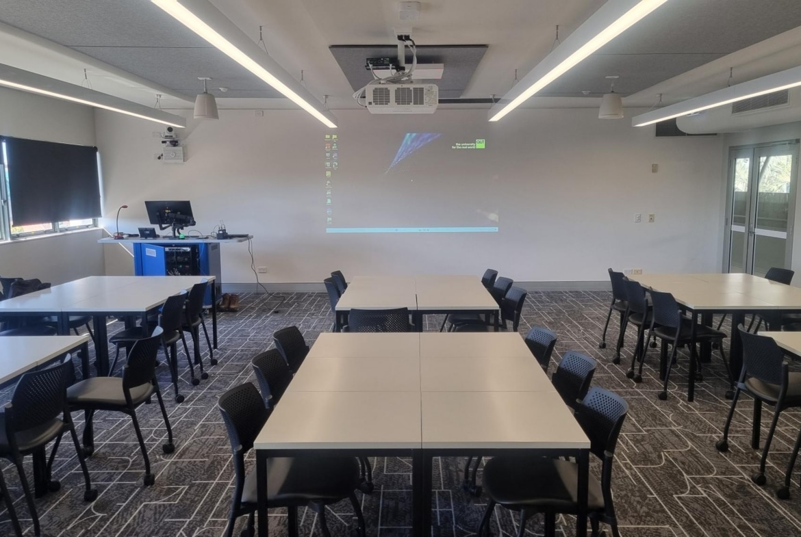 The T090 Medium Teaching Space at QUT is a versatile, mid-sized educational environment designed to support presenter-led instruction with flexible BYOD connectivity. Combining professional-grade Audio Visual and Unified Communications technologies, the room delivers a confident, classroom-ready AV experience. The space features a Panasonic PT-FRZ50 laser projector with a dedicated preview monitor, and a Kramer VSM-4x4A matrix switcher routing four source inputs — PC, HDMI, USB, and Screencast. A Sennheiser TCC2 ceiling array microphone alongside a Shure ULXD4D dual wireless receiver provides comprehensive audio coverage across three microphone channels, while two PT20X-4K PTZ cameras support lecture capture and visual engagement. Operating on an Audio Video over IP (AVoIP) infrastructure powered by Magewell NDI encoders and decoders, the room is controlled via an AMX VARIA-80 touch panel running Innomate’s HTML-based Innomesh interface. A QSC Q-SYS Core 8 Flex DSP handles all audio processing, and an Atlona occupancy sensor automates system shutdown for energy efficiency. Deployed across 17 rooms at QUT, the T090 is fully integrated into Innomate’s Innomesh AV SaaS Platform, ensuring reliable AV Room Control, proactive AV Remote Monitoring and Management, and seamless ongoing support through Innomate’s AVaaS and UCaaS models.